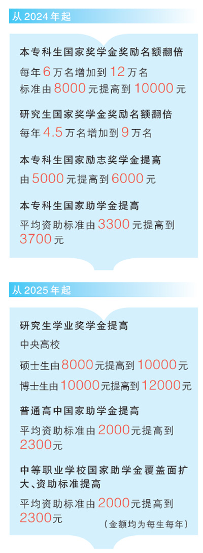——本專科生國家獎學金獎勵名額翻倍,提高獎勵標準。從2024年起,將本??粕鷩要剬W金獎勵名額由每年6萬名增加到12萬名,獎勵標準由每生每年8000元提高到10000元。