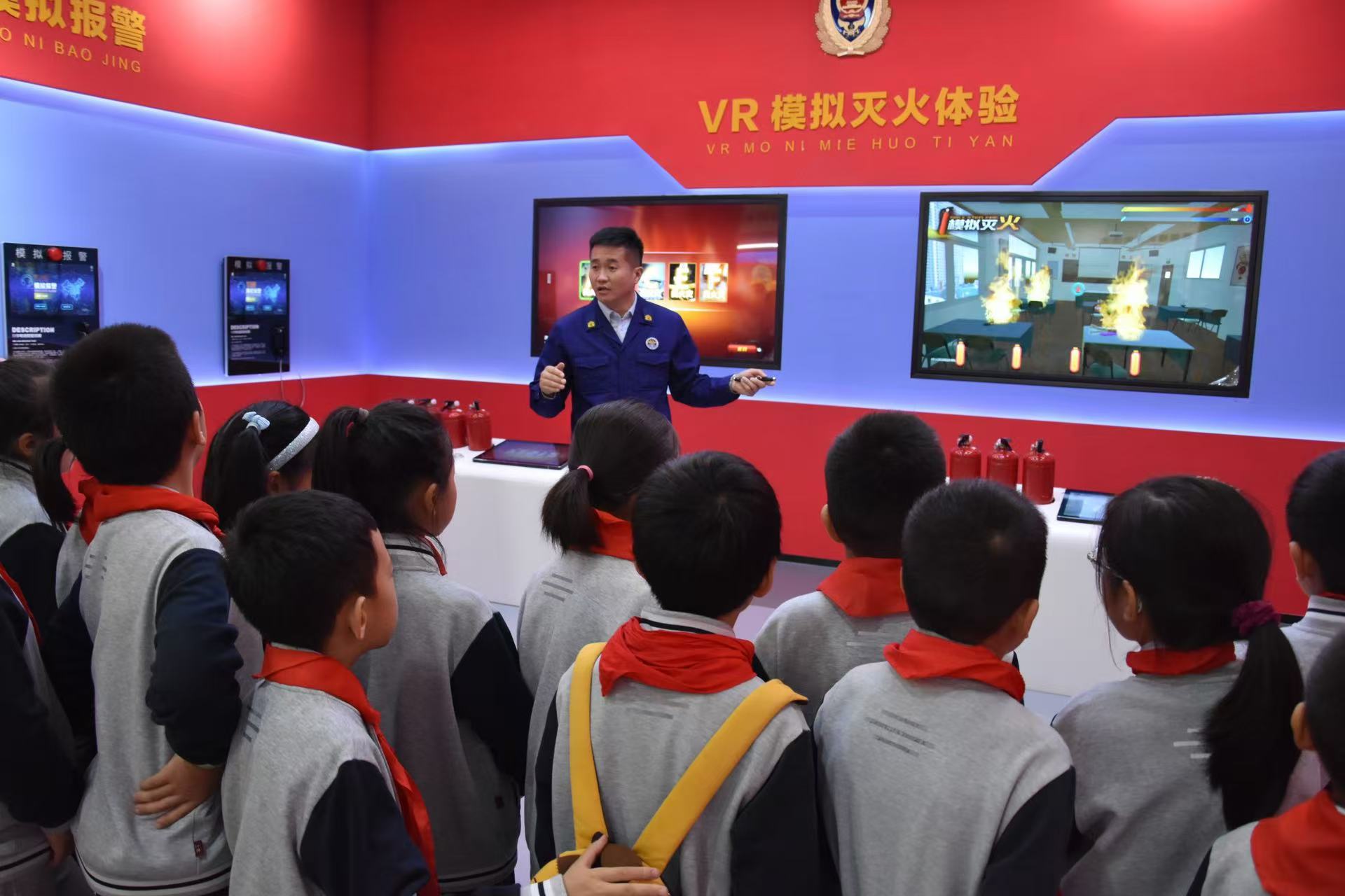在模擬報警體驗區(qū),隊員們通過撥打119電話與虛擬接警員進(jìn)行互動,學(xué)習(xí)正確的報警方法;在VR模擬滅火區(qū),講解員生動講解不同火災(zāi)場景下滅火器的正確選擇與使用方法,還給隊員們介紹了消防救援人員在滅火救援過程中使用到的專業(yè)滅火救援器材、各式消防車模型以及各類消防標(biāo)識。