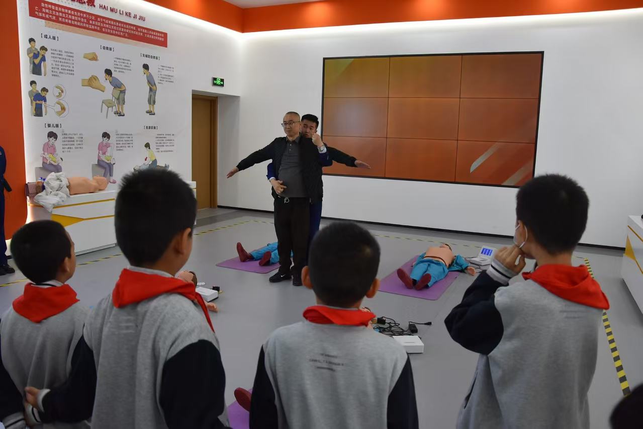在應(yīng)急救護(hù)展區(qū),講解員介紹了自救互救實訓(xùn)演練相關(guān)知識,包括燒燙傷處理、氣管異物急救、海姆立克急救法等急救知識。在講解員的指導(dǎo)下,隊員們進(jìn)行心肺復(fù)蘇實訓(xùn)演練等急救技能的實訓(xùn)“初體驗”,提高自救和互救能力。