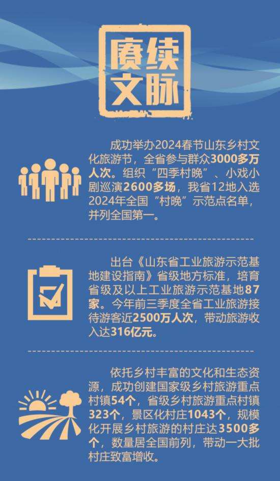 在山東,許多傳統(tǒng)古村落因?yàn)槲幕匦隆盎睢绷似饋?。?jì)南市章丘區(qū)文祖鎮(zhèn)三德范村憑借國家級非遺扛芯子遠(yuǎn)近聞名,巨野縣核桃園鎮(zhèn)前王莊村保護(hù)修繕傳統(tǒng)民居成為鄉(xiāng)村旅游勝地,榮成市牧云庵村依托“畫村”傳統(tǒng)文化發(fā)展文旅產(chǎn)業(yè)……此外,山東省打造“好客山東·鄉(xiāng)村好時(shí)節(jié)”品牌,設(shè)立體驗(yàn)基地37處,舉辦各類鄉(xiāng)村文旅活動3000多場次,實(shí)現(xiàn)以旅游高質(zhì)量發(fā)展賦能鄉(xiāng)村全面振興。