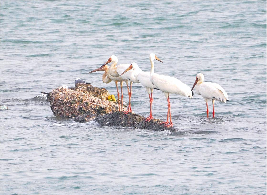 近日,在位于山東長(zhǎng)島國家級(jí)自然保護(hù)區(qū)的月牙灣景區(qū)礁石上,5只國家一級(jí)保護(hù)野生動(dòng)物白鶴悠然佇立(上圖)。