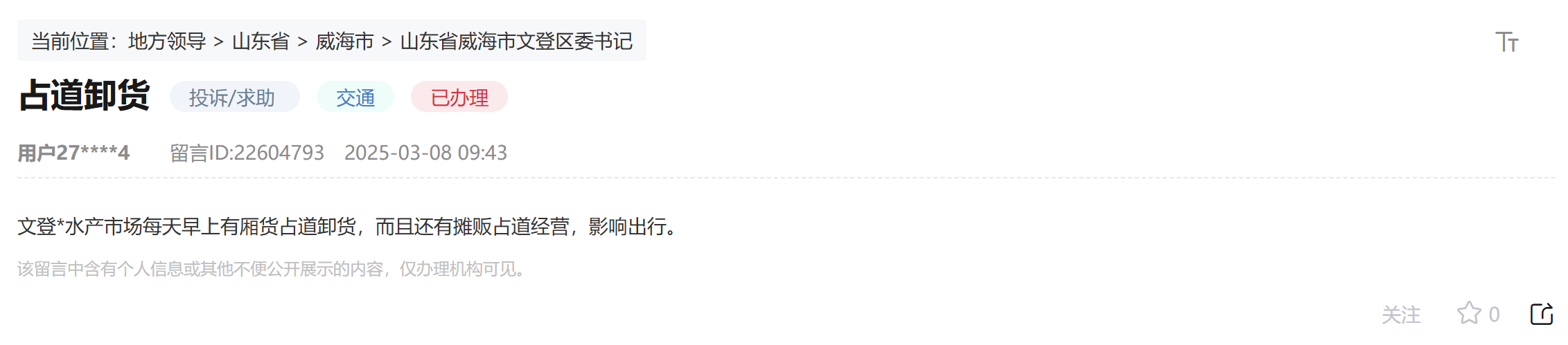 “文登一水產(chǎn)市場每天早上有廂貨占道卸貨,而且還有攤販占道經(jīng)營,影響出行。”近日,威海市一網(wǎng)友在“領(lǐng)導(dǎo)留言板”中寫道。
