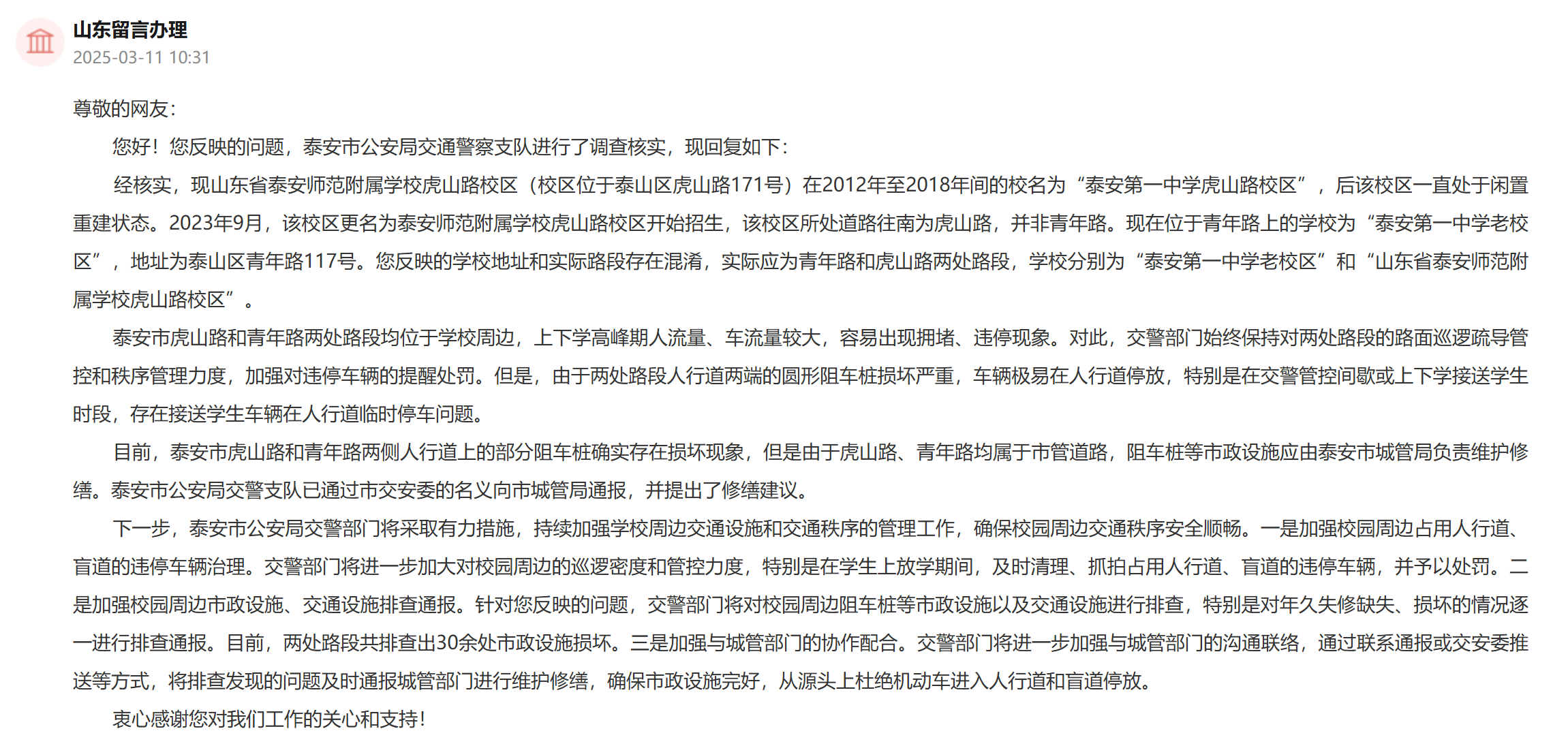 收到留言后,泰安市公安局交通警察支隊進(jìn)行了調(diào)查核實?;貜?fù)稱:現(xiàn)山東省泰安師范附屬學(xué)?;⑸铰沸^(qū)(校區(qū)位于泰山區(qū)虎山路171號)在2012年至2018年間的校名為“泰安第一中學(xué)虎山路校區(qū)”,后該校區(qū)一直處于閑置重建狀態(tài)。2023年9月,該校區(qū)更名為泰安師范附屬學(xué)?;⑸铰沸^(qū)開始招生,該校區(qū)所處道路往南為虎山路,并非青年路?,F(xiàn)在位于青年路上的學(xué)校為“泰安第一中學(xué)老校區(qū)”,地址為泰山區(qū)青年路117號。網(wǎng)友反映地點(diǎn)應(yīng)為青年路和虎山路兩處路段,學(xué)校分別為“泰安第一中學(xué)老校區(qū)”和“山東省泰安師范附屬學(xué)?;⑸铰沸^(qū)”。
