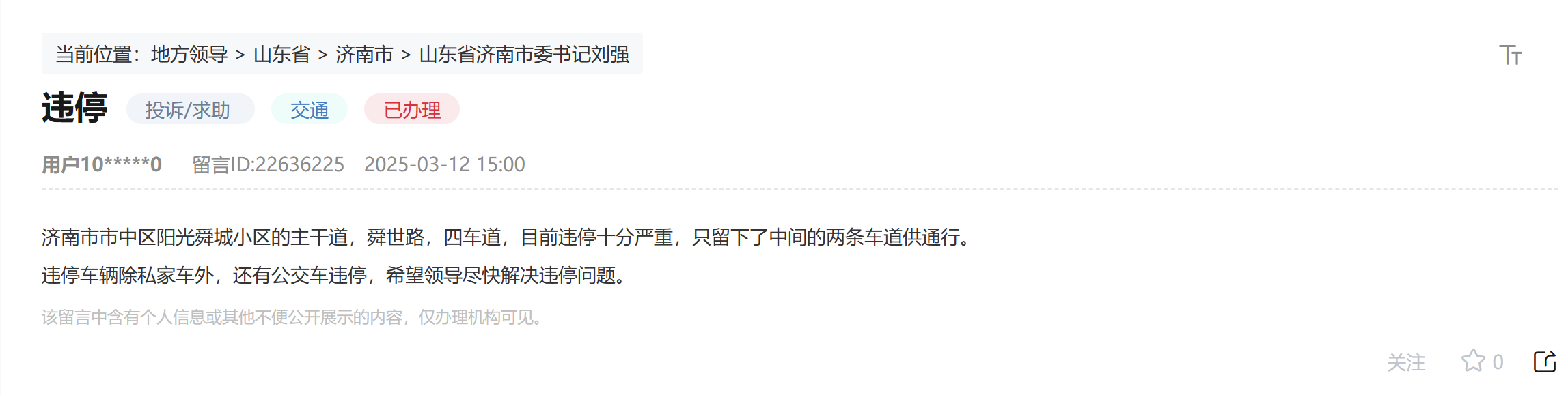 “濟(jì)南市市中區(qū)陽光舜城小區(qū)的主干道,舜世路,四車道,目前違停十分嚴(yán)重,只留下了中間的兩條車道供通行?!苯眨瑵?jì)南一網(wǎng)友在“領(lǐng)導(dǎo)留言板”反映道,違停車輛除私家車外,還有公交車,希望盡快解決違停問題。