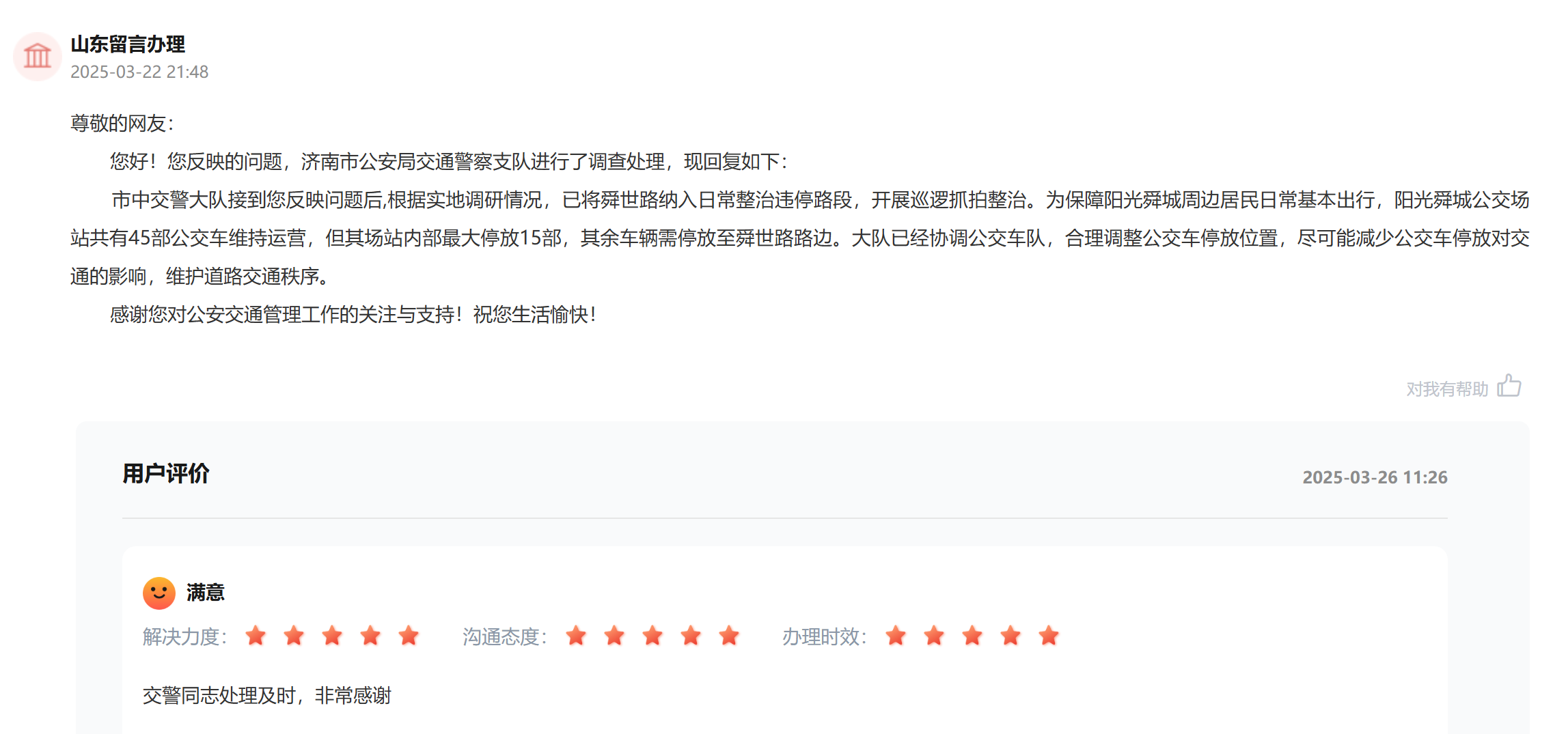 收到留言后,濟(jì)南市公安局交通警察支隊進(jìn)行了調(diào)查處理,根據(jù)實地調(diào)研情況,已將舜世路納入日常整治違停路段,開展巡邏抓拍整治。