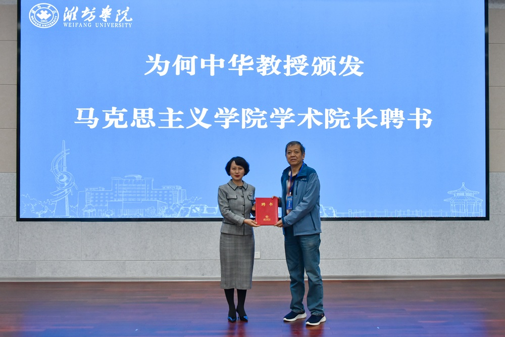 何中華受聘擔(dān)任濰坊學(xué)院馬克思主義學(xué)院學(xué)術(shù)院長,韓冬雪、孫熙國、白剛受聘擔(dān)任濰坊學(xué)院特聘教授。徐梅為各位專家頒發(fā)聘書。