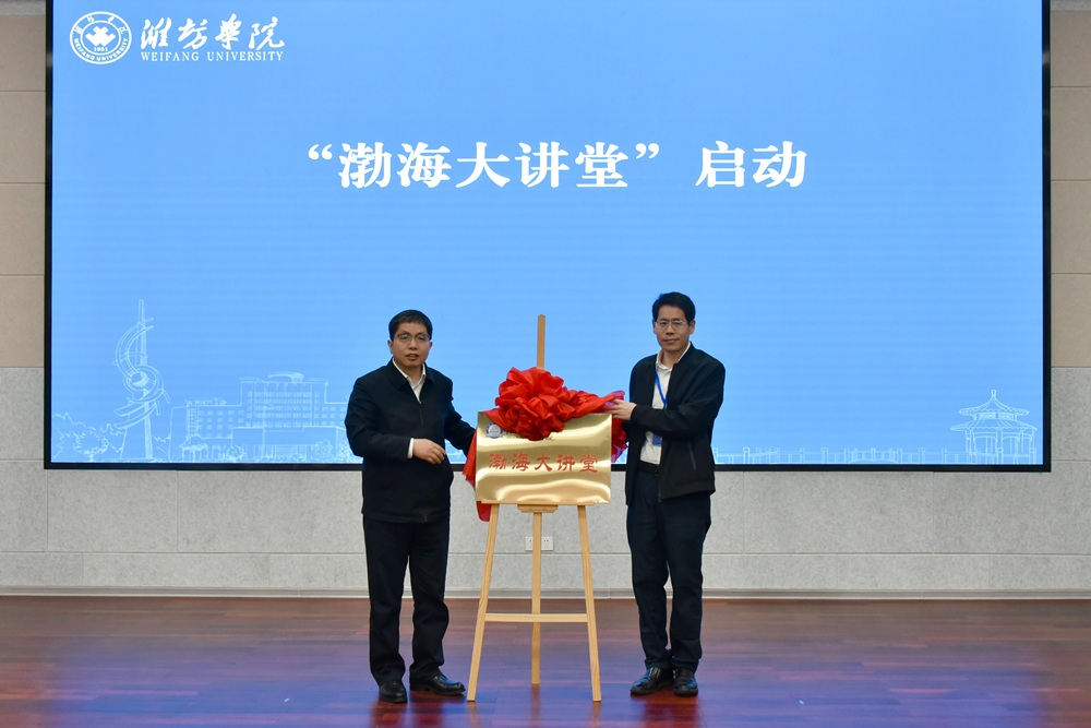 苗金春與李佃來共同為“渤海大講堂”揭牌?!安澈4笾v堂”的設(shè)立,旨在進(jìn)一步濃厚學(xué)術(shù)氛圍,更好搭建學(xué)術(shù)交流平臺,定期邀請國內(nèi)外頂級專家學(xué)者到校授課講學(xué),分享最新研究成果,幫助我校進(jìn)一步提升學(xué)科建設(shè)水平和科學(xué)研究能力,推動學(xué)術(shù)研究的繁榮與進(jìn)步。