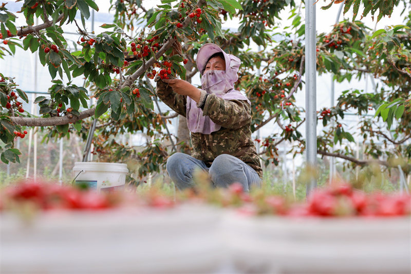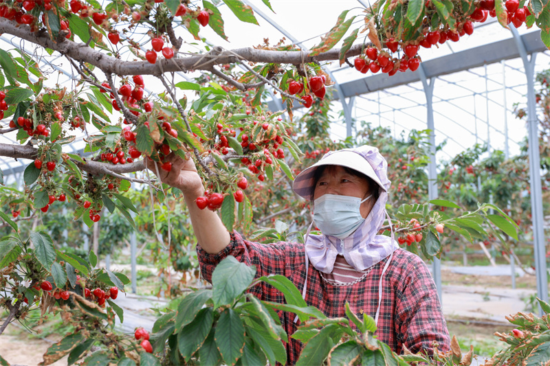 “這些可都是市場(chǎng)的搶手貨?!贝豪偌彝マr(nóng)場(chǎng)負(fù)責(zé)人張萬(wàn)平站在綴滿(mǎn)果實(shí)的櫻桃架下介紹。果葉掩映間,“美棗”品種泛著琥珀般的光澤,“布魯克斯”則如紅寶石般璀璨奪目。這位與土地打了十余年交道的“櫻桃專(zhuān)家”輕撫果實(shí):“園區(qū)170畝地種植了十多個(gè)優(yōu)質(zhì)品種,畝均收益在2至3萬(wàn)元左右,主要銷(xiāo)往京津冀市場(chǎng),深受消費(fèi)者喜愛(ài)?!?/p>