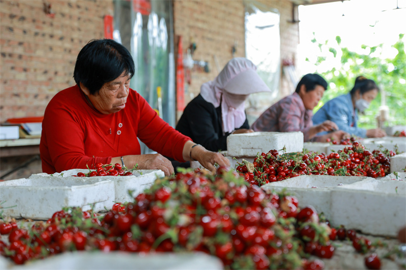 5月8日,在山東省聊城市茌平區(qū)洪官屯鎮(zhèn)春蕾家庭農(nóng)場(chǎng),紅瑪瑙般的櫻桃綴滿(mǎn)枝頭,晨露映照下泛著晶瑩光澤。果農(nóng)們穿梭于果樹(shù)間,靈巧的指尖輕掠枝頭,顆顆櫻桃如珠玉落盤(pán)。分揀車(chē)間內(nèi),工人們正按果徑、品種的不同,將鮮果分級(jí)裝盒,冷鏈運(yùn)輸車(chē)在園區(qū)外整裝待發(fā),空氣中彌漫著清甜的豐收氣息。