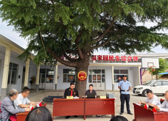 “我們了解到,原告、被告是同村村民且為鄰居。為推進(jìn)矛盾糾紛就地化解,我們決定將法庭搬到村委大院,現(xiàn)場開庭?!痹摪赋修k法官王東寶說。