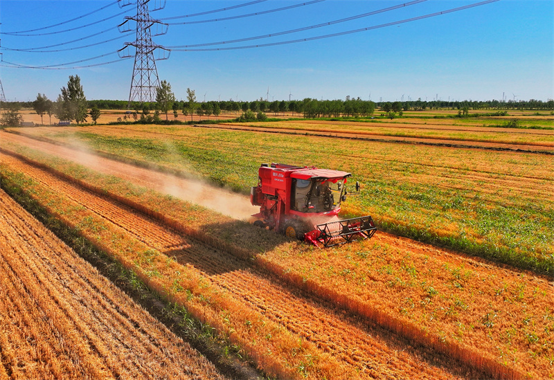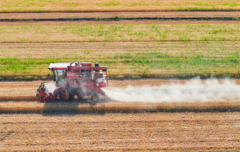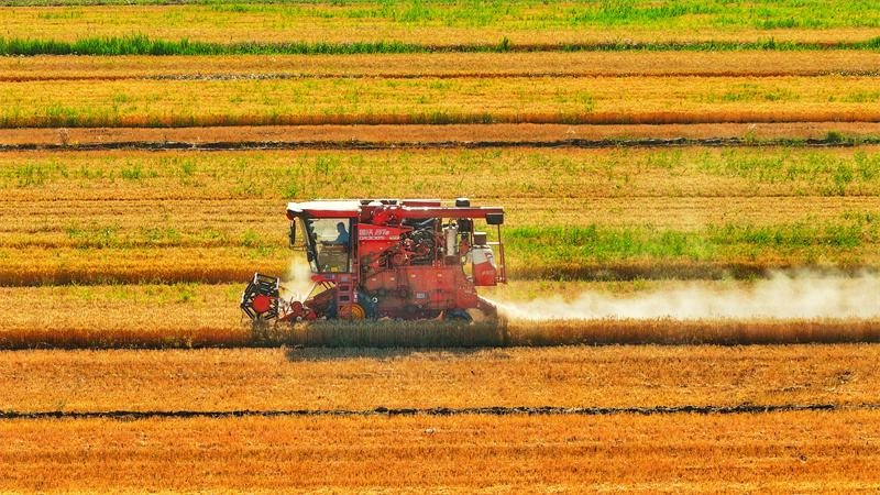 2025年6月4日,在山東省樂(lè)陵市鐵營(yíng)鎮(zhèn)一處改良鹽堿地里,農(nóng)機(jī)手駕駛大型機(jī)械在收割小麥。