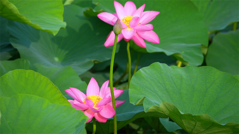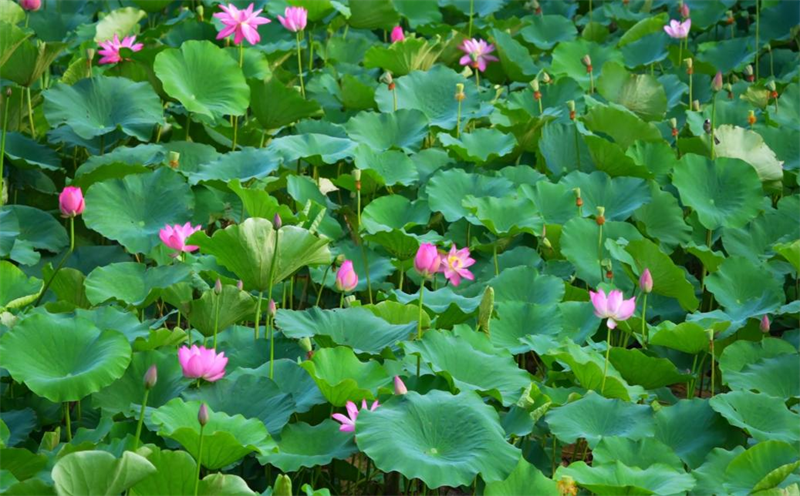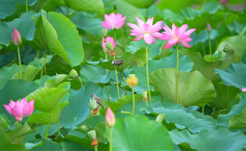 踏入濕地,荷葉層層疊疊,如翠綢鋪展,高低錯(cuò)落間,繪就自然曲線。粉白荷花,似仙子臨世;有的含羞,藏心事于花苞;有的熱烈,展芳華于天地;有的半掩,露嬌憨之態(tài);清風(fēng)過處,荷枝輕搖,花葉摩挲,暗香浮動(dòng)。