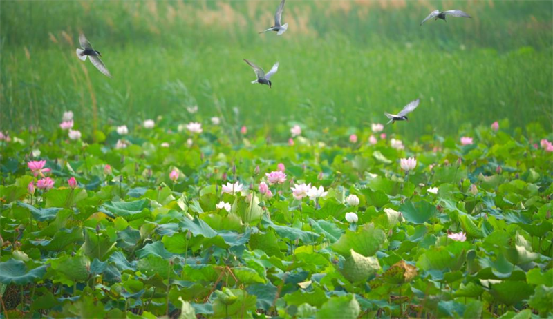 在不遠(yuǎn)處的濕地,數(shù)十只須浮鷗盤旋飛舞,它們身姿輕盈,時(shí)而俯沖掠過水面,時(shí)而展翅飛向高空,為這幅靜謐的荷花圖增添了靈動(dòng)的氣息。碧水、翠葉、粉荷、飛鳥,共同奏響了夏日的交響曲。