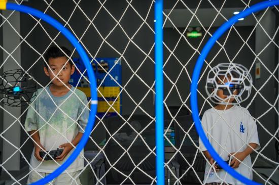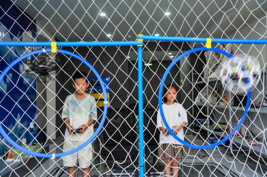 2025年7月22日,在山東省樂陵市市中街道碼高科技編程中心,孩子們?cè)诰毩?xí)無人機(jī)穿圈操作。