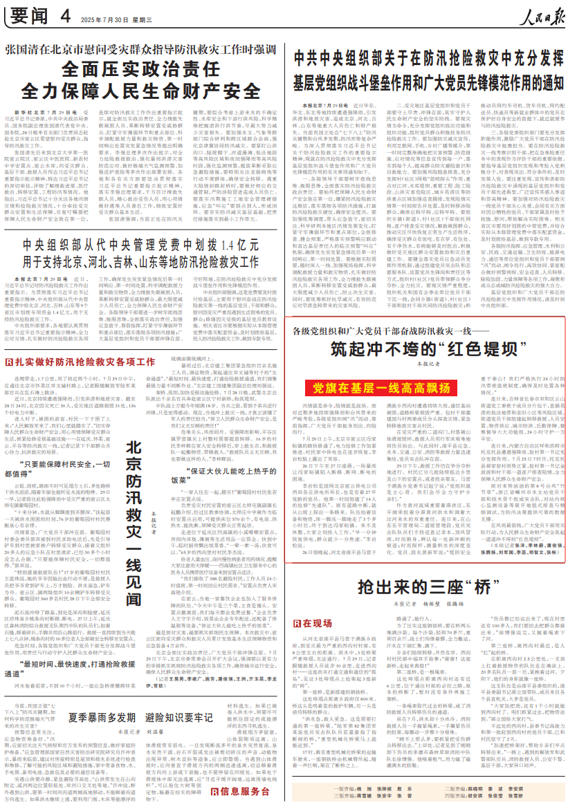 人民日?qǐng)?bào)關(guān)注山東等地黨組織和黨員干部奮戰(zhàn)防汛救災(zāi)一線:筑起沖不垮的“紅色堤壩”