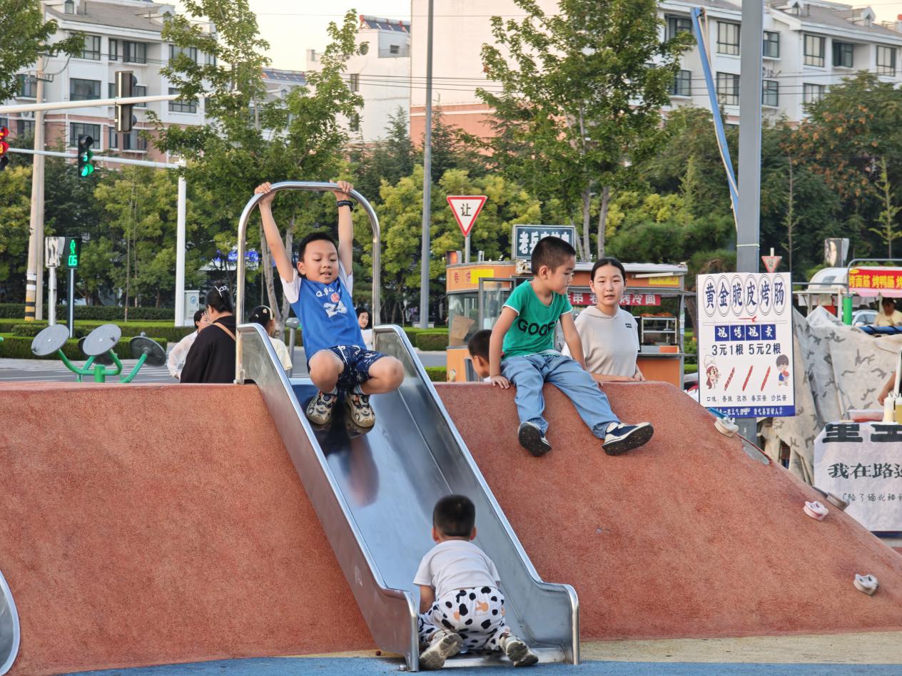 立秋時(shí)節(jié),傍晚已有絲絲涼意,濰坊峽山區(qū)市民活動中心口袋公園里傳來陣陣歡聲笑語,孩童互相追逐的嬉鬧聲、大人湊在一起的閑聊聲、攤販招攬生意的叫賣聲交織在一起,勾勒出一幅彰顯民生溫度的生動畫面。家住文華苑的徐女士帶著兒子在滑梯上玩耍:“這里設(shè)施、環(huán)境都很好,離家也很近,下了班沒事就過來遛遛娃,散散步,十分愜意?!?/p>