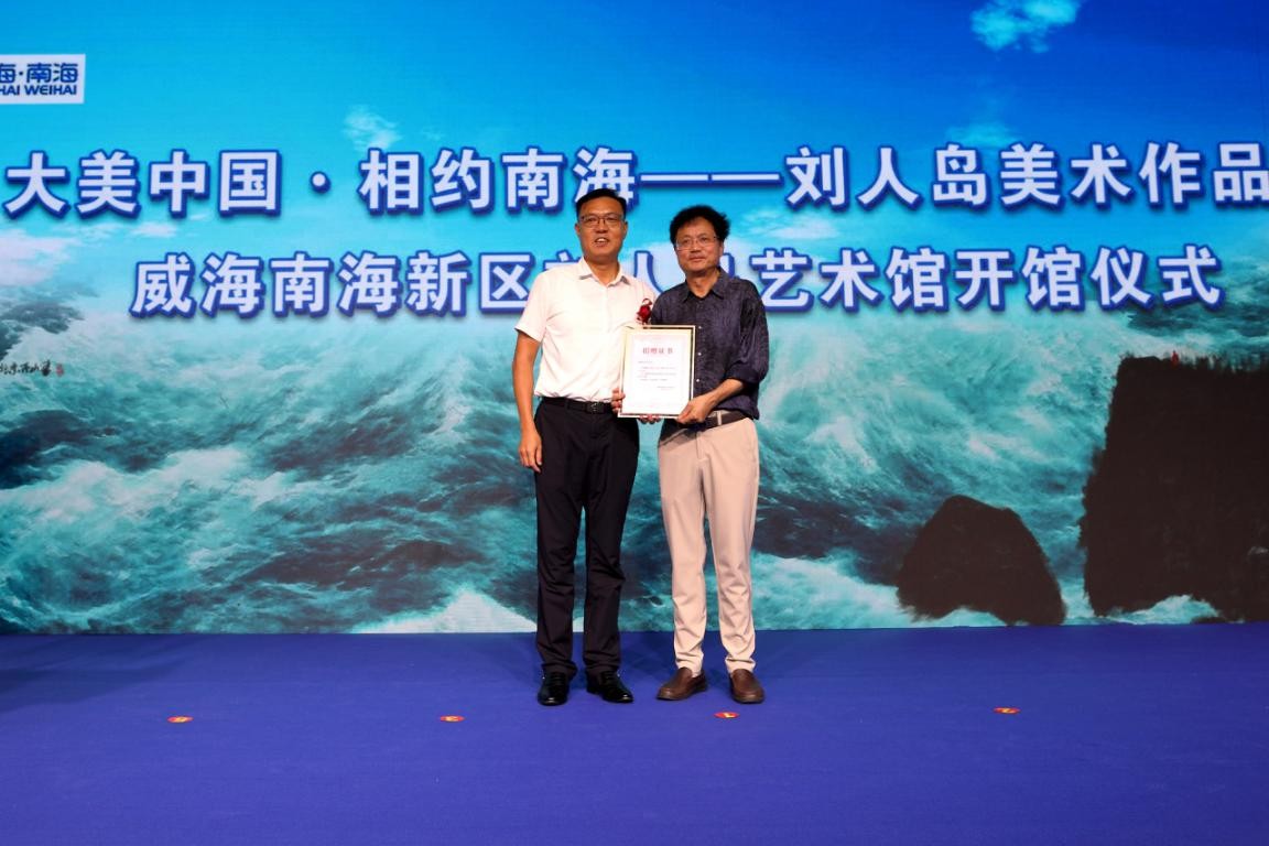 儀式現(xiàn)場,藝術(shù)家劉人島向威海南海新區(qū)捐贈不低于人民幣4000萬元的個人作品、名家書畫作品70余件,威海南海新區(qū)管委會副主任劉強(qiáng)勝代表威海南海新區(qū)接受捐贈并為劉人島頒發(fā)捐贈證書。