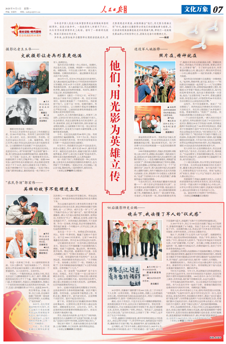 多年來,全國各地多名攝影師長期跟拍抗戰(zhàn)老兵,用光影展現(xiàn)老兵英姿。本版特推出“他們,用光影為英雄立傳”???名攝影師分享他們的拍攝故事與感悟,從記錄者的視角描摹抗戰(zhàn)老兵的英雄氣概,帶我們一起致敬先輩血捍山河的信仰之力,汲取矢志奮斗的精神之光。