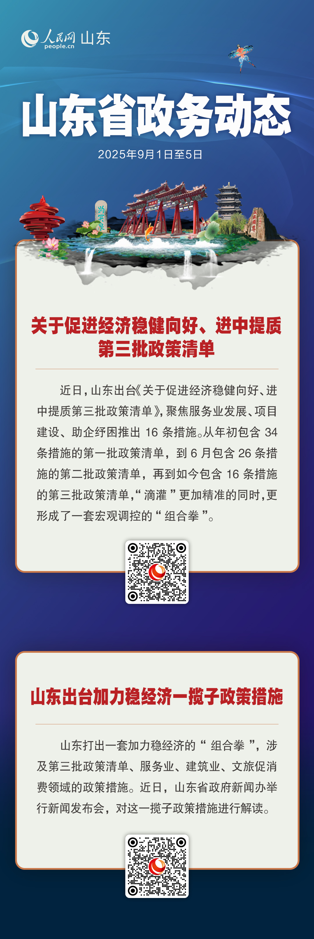 本周(9月1日至9月5日),山東出臺《關于促進經濟穩(wěn)健向好、進中提質第三批政策清單》等加力穩(wěn)經濟一攬子政策措施,具體如下: