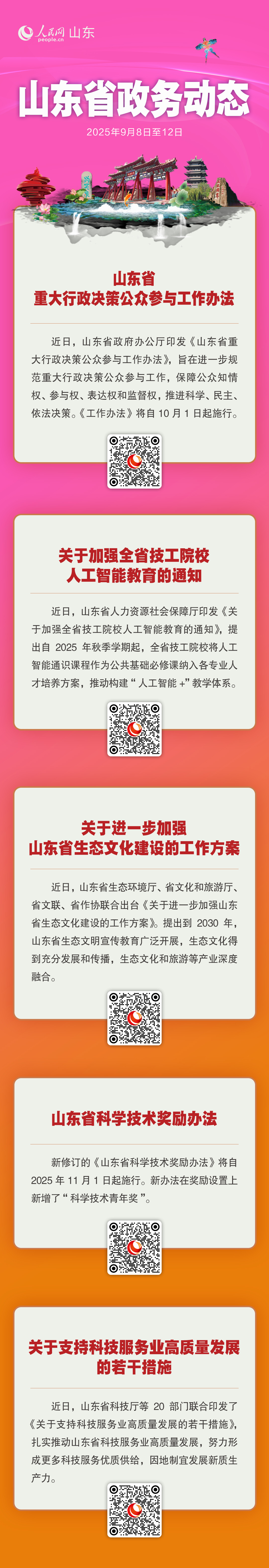 本周(9月8日至9月12日),山東出臺《山東省重大行政決策公眾參與工作辦法》《關(guān)于加強(qiáng)全省技工院校人工智能教育的通知》《關(guān)于進(jìn)一步加強(qiáng)山東省生態(tài)文化建設(shè)的工作方案》《山東省科學(xué)技術(shù)獎勵辦法》《關(guān)于支持科技服務(wù)業(yè)高質(zhì)量發(fā)展的若干措施》,具體如下:
