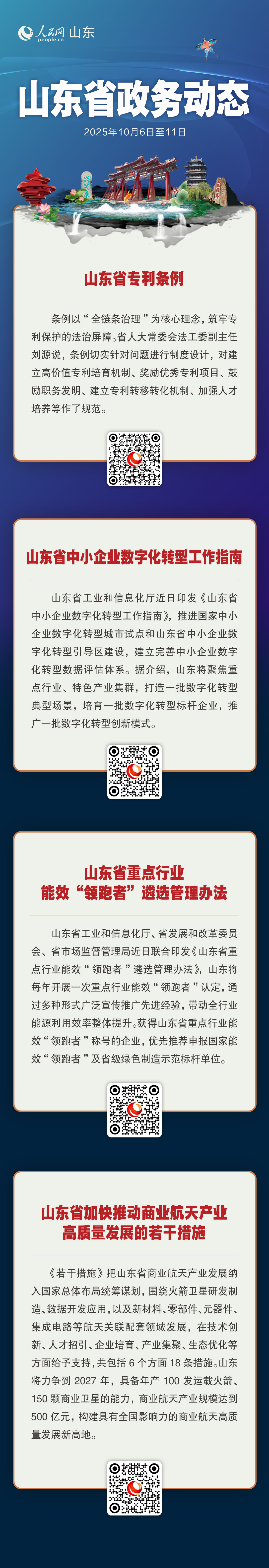 本周(10月6日至10月11日)山東出臺《山東省專利條例》《山東省中小企業(yè)數(shù)字化轉(zhuǎn)型工作指南》《山東省重點(diǎn)行業(yè)能效“領(lǐng)跑者”遴選管理辦法》《山東省加快推動商業(yè)航天產(chǎn)業(yè)高質(zhì)量發(fā)展的若干措施》,具體如下: