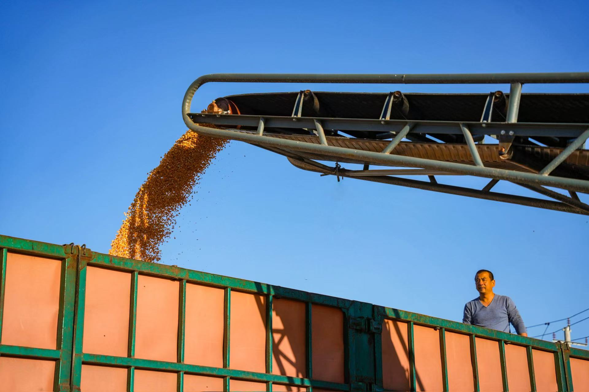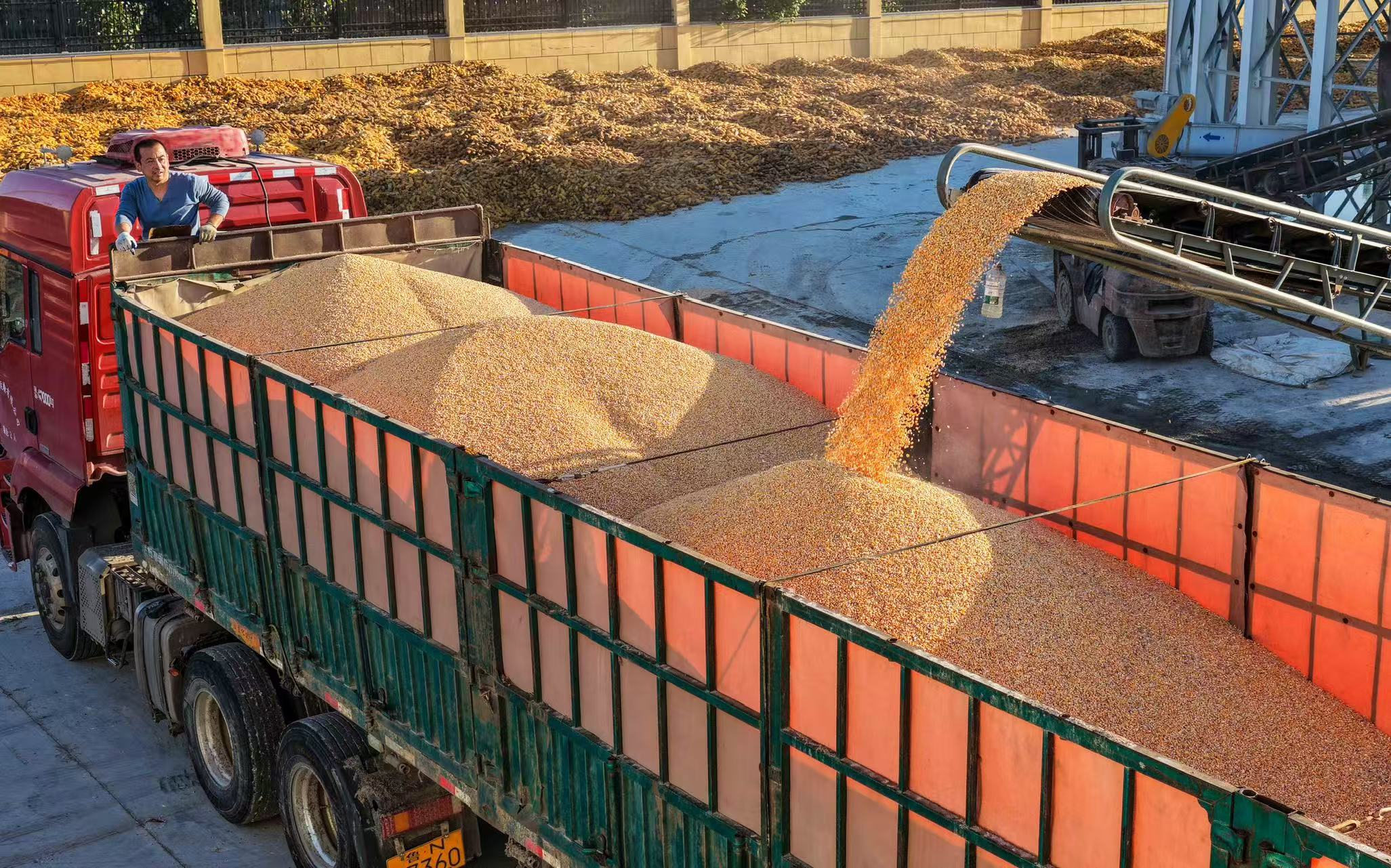 10月13日,山東省樂(lè)陵市冀魯邊鄉(xiāng)村振興綜合服務(wù)中心,工作人員將烘干的玉米裝車收儲(chǔ)。