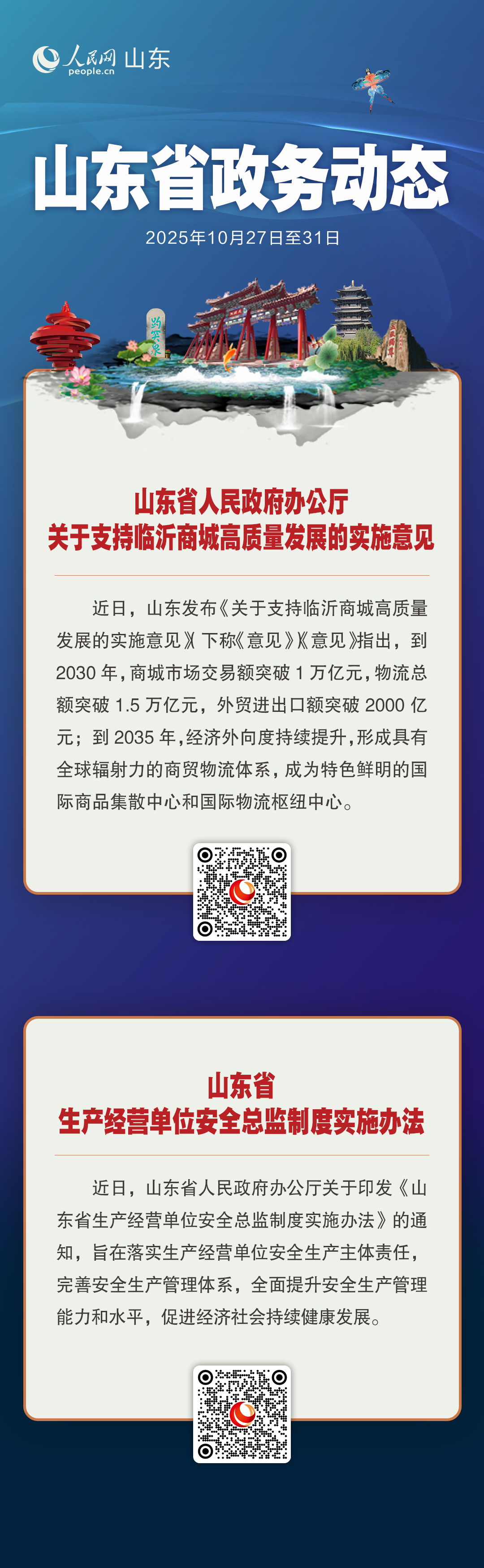 本周(10月27日至10月31日)山東出臺《關(guān)于支持臨沂商城高質(zhì)量發(fā)展的實施意見》《山東省生產(chǎn)經(jīng)營單位安全總監(jiān)制度實施辦法》,具體如下:
