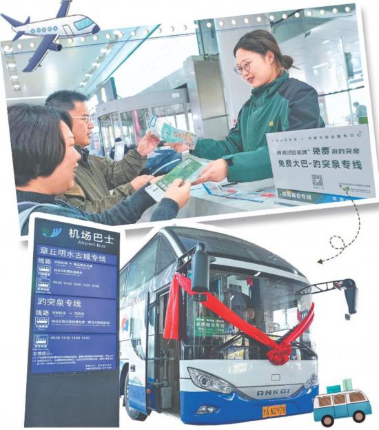 上圖:10月27日,濟南機場出口柜臺處,兩位旅客憑登機牌領(lǐng)取免費游趵突泉景區(qū)兌換券。下圖:濟南機場至趵突泉景區(qū)專線巴士。