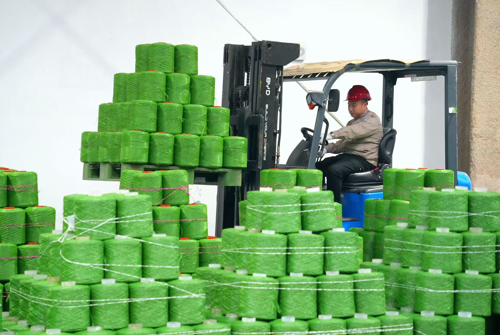 11月6日,工人在山東省樂陵市經(jīng)濟開發(fā)區(qū)泰山人造草坪有限公司生產(chǎn)線上趕制出口訂單。