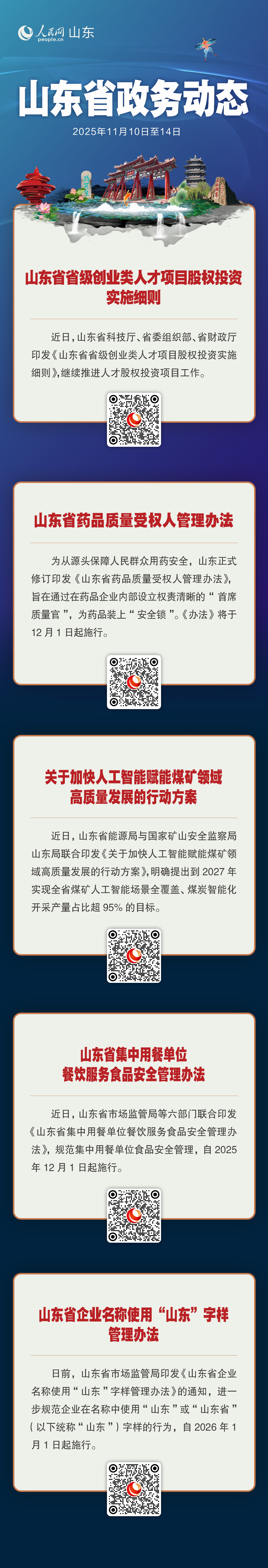 本周(11月10日至11月14日)山東出臺《山東省省級創(chuàng)業(yè)類人才項目股權(quán)投資實施細(xì)則》《山東省藥品質(zhì)量受權(quán)人管理辦法》《關(guān)于加快人工智能賦能煤礦領(lǐng)域高質(zhì)量發(fā)展的行動方案》《山東省集中用餐單位餐飲服務(wù)食品安全管理辦法》《山東省企業(yè)名稱使用“山東”字樣管理辦法》,具體如下: