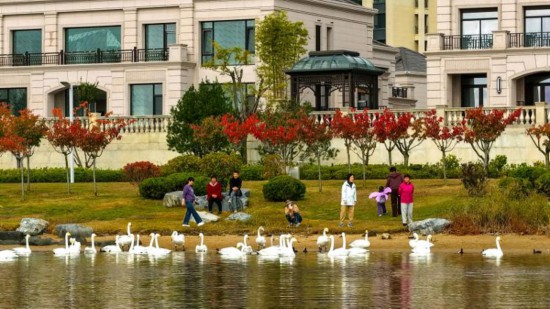 2025年10月31日,山東省榮成市櫻花湖公園,市民在岸邊觀賞并迎接遠(yuǎn)道而來的美麗的大天鵝。