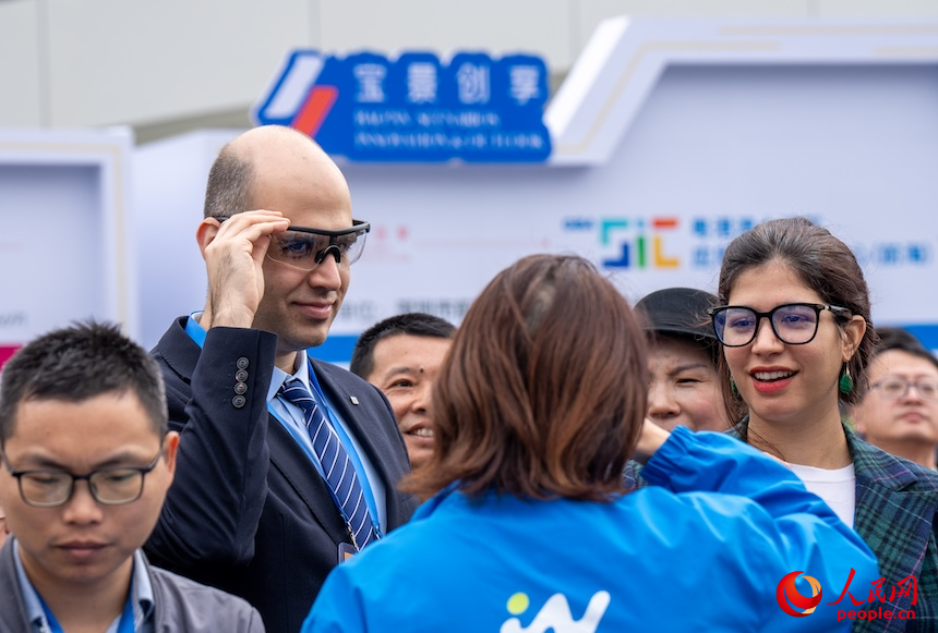 外國(guó)客商體驗(yàn)智能眼鏡產(chǎn)品。人民網(wǎng) 王星攝