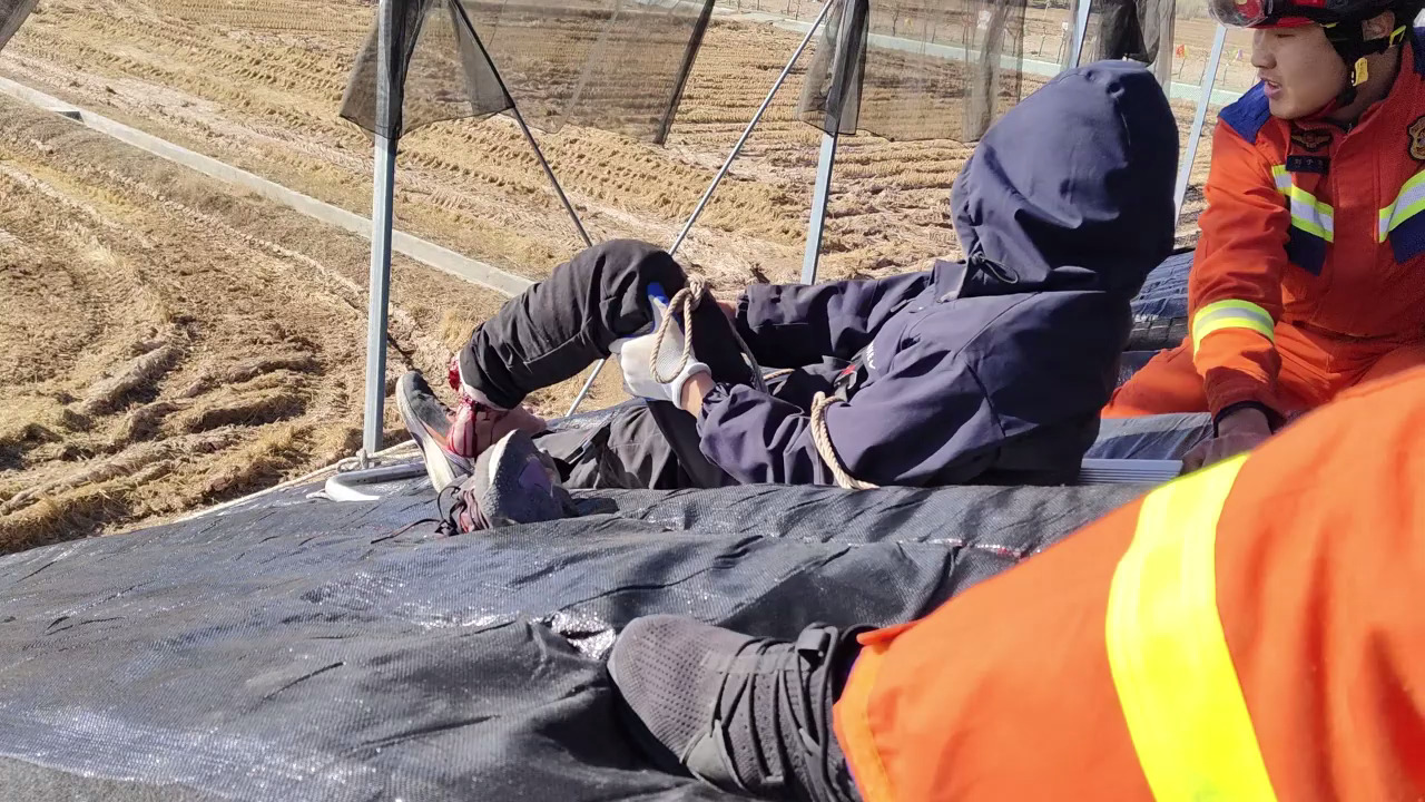 途中經(jīng)電話詢(xún)問(wèn),現(xiàn)場(chǎng)事故發(fā)生為農(nóng)場(chǎng)主在鋪設(shè)大棚保溫膜時(shí),滾輪突發(fā)掉落不僅將其腿部壓住,還導(dǎo)致左腳腳踝意外脫落,男子被困大棚上方無(wú)法移動(dòng),消防救援到達(dá)現(xiàn)場(chǎng)后立即進(jìn)行勘察,被困男子身處大棚高處,因左腳腳踝嚴(yán)重受傷失去行動(dòng)能力,消防救援人員根據(jù)現(xiàn)場(chǎng)情況立即實(shí)施救援,首先架設(shè)9米拉梯到達(dá)男子所在位置,再將其抬至擔(dān)架并做好保護(hù)固定避免轉(zhuǎn)移過(guò)程中造成二次傷害隨后與其余救援人員進(jìn)行配合對(duì)受傷人員進(jìn)行轉(zhuǎn)移,經(jīng)過(guò)一番緊張的救援,成功將男子營(yíng)救至安全區(qū)域,隨后交由現(xiàn)場(chǎng)120醫(yī)護(hù)人員送往醫(yī)院進(jìn)行救治。