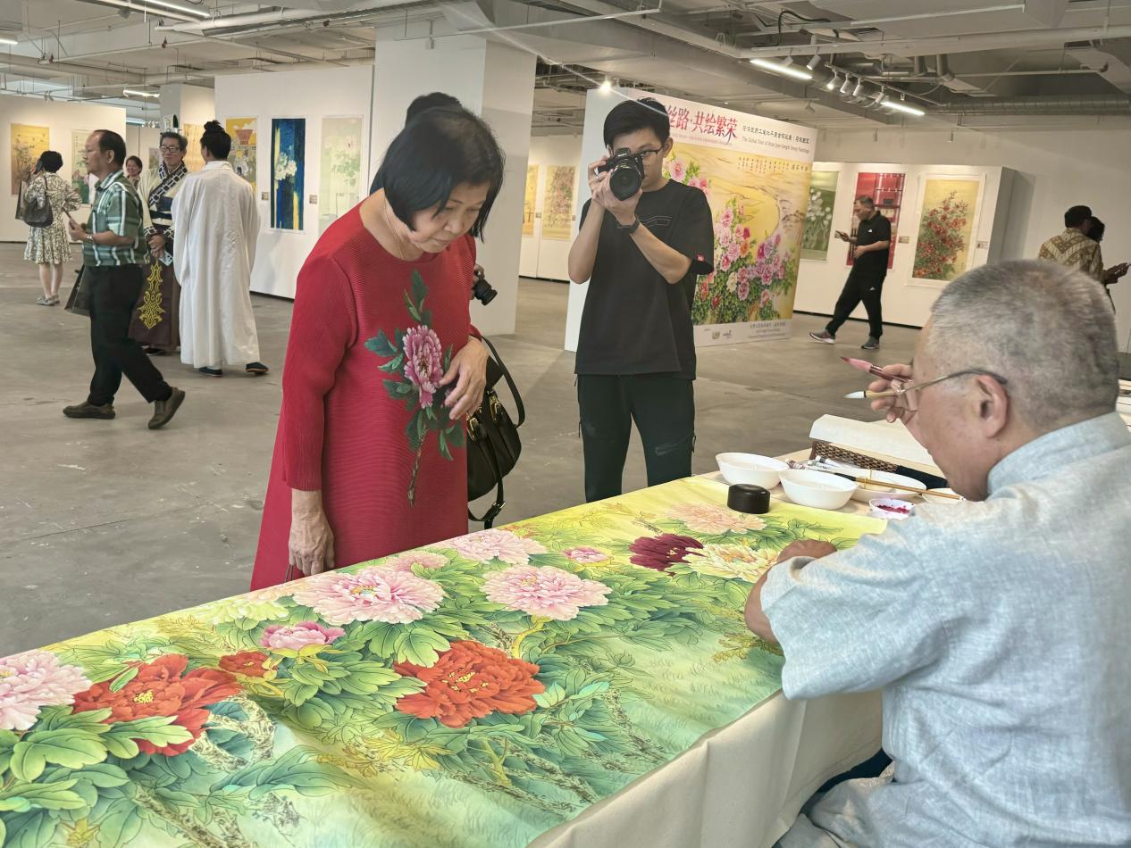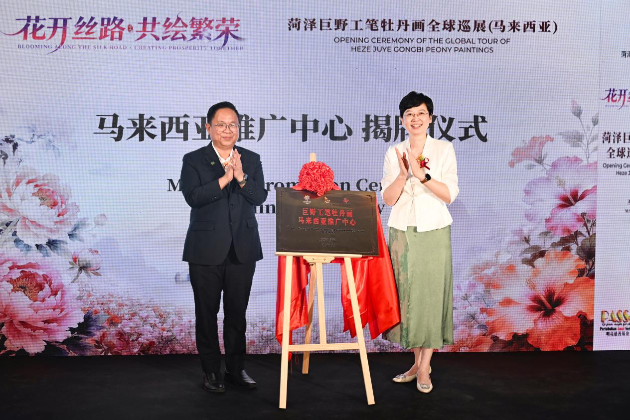 在與會嘉賓的共同見證下,巡展活動正式啟動。曹臨與梁德志共同為“巨野工筆牡丹畫馬來西亞推廣中心”揭牌,未來將依托推廣中心傳播渠道,持續(xù)推動山東菏澤巨野工筆牡丹畫在馬來西亞落地生根、芬芳遠揚。啟動儀式后,與會嘉賓與現(xiàn)場觀眾一同感受了由40幅巨野工筆牡丹畫精品、30幅世界各國特色花卉工筆畫佳作以及20余件牡丹主題文創(chuàng)產(chǎn)品共同構(gòu)建的沉浸式藝術(shù)長廊,在筆墨色彩間領(lǐng)略跨越山海的美學(xué)對話。