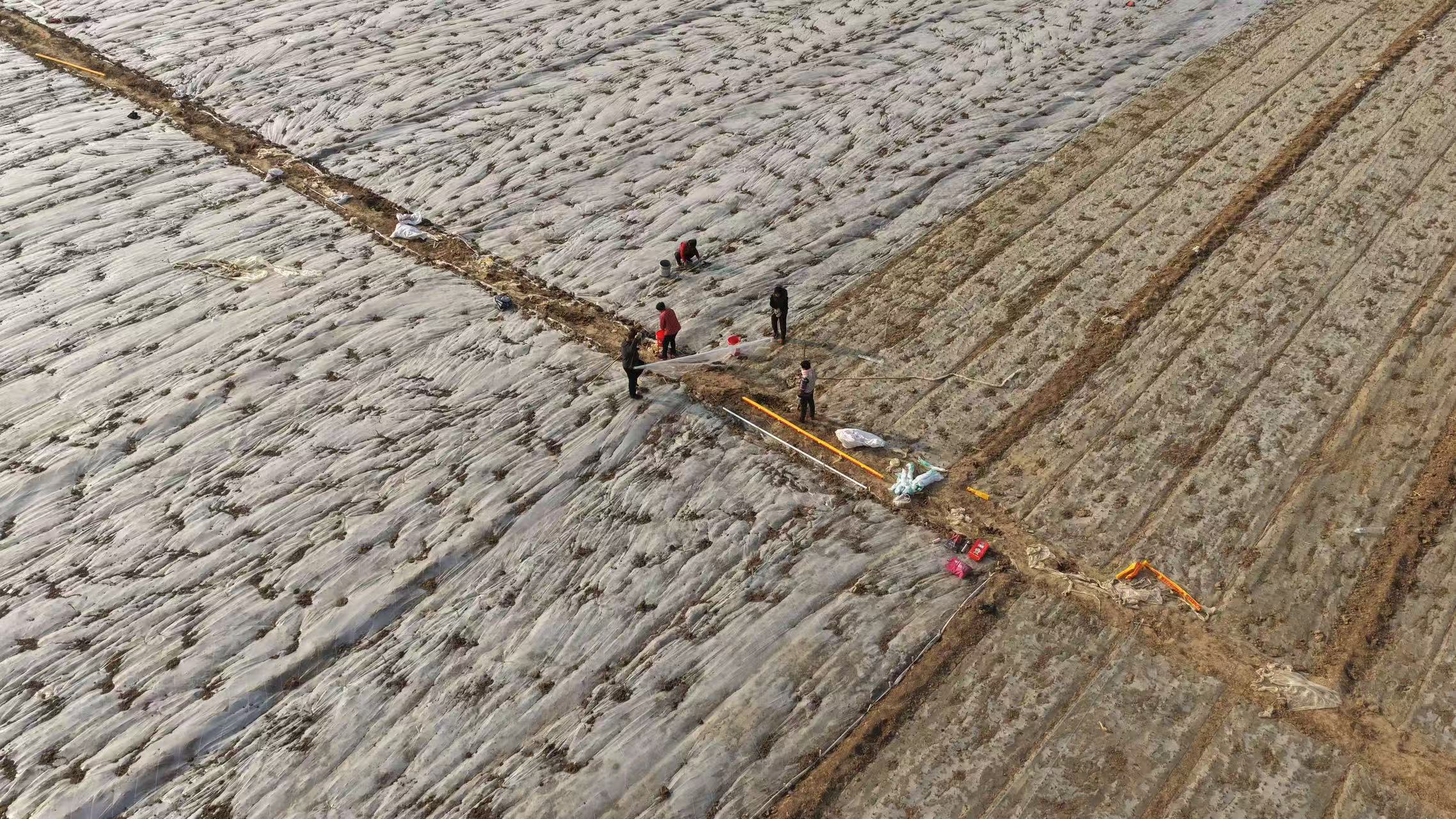 12月10日,在山東省聊城市茌平區(qū)賈寨鎮(zhèn)苗莊村田間,村民在給種植的大蒜覆蓋防寒薄膜。趙玉國攝